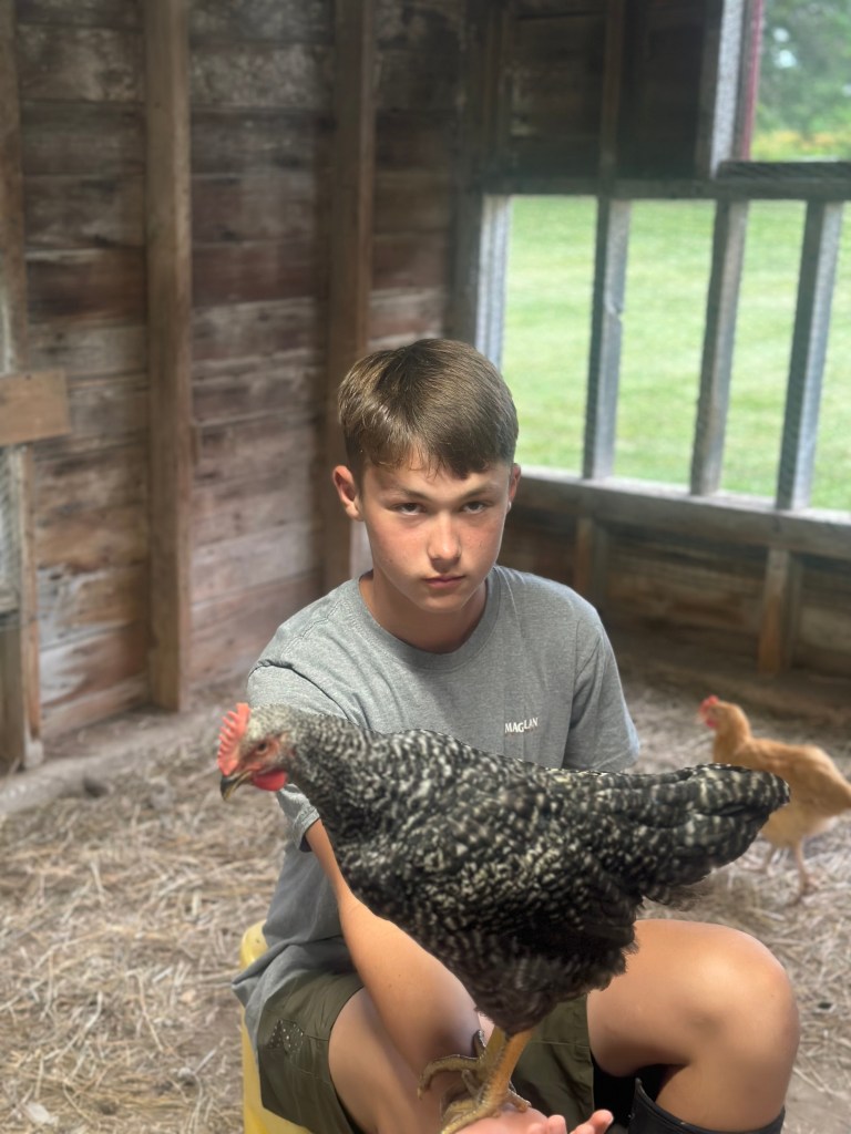 Matthew and his friend Ledger decided to start a chicken business this year and they are learning all the things about both meat and egg chickens. They are also learning invaluable lessons about business, having a business partner and how to keep track of income/expenses. I’m super proud of them for all of their hard work cleaning out this old coop and fixing it up to be safe for the chickens and all of the research they’ve done to figure this out. Matthew spends every day at that coop, more than once a day and he will just go and sit in there with the chickens. The one he’s holding in his hand, he just puts his hand on the grand and it will come straight to him and let him pick it up like that.